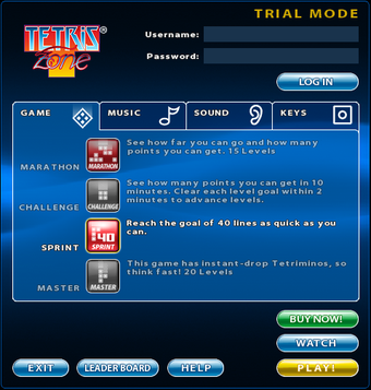 Tetris Zone offre 4 modalità di gioco: Marathon (15 livelli per dita allenate), Challenge (10 minuti per fare del tuo meglio), Sprint (completa 40 linee nel minor tempo possibile) e Master (Tetris per menti superiori). Se ti piacciono le sfide "non convenzionali" di Tetris, potresti provare anche il bellissimo NullpoMino, gratuito e con tantissime modalità di gioco.